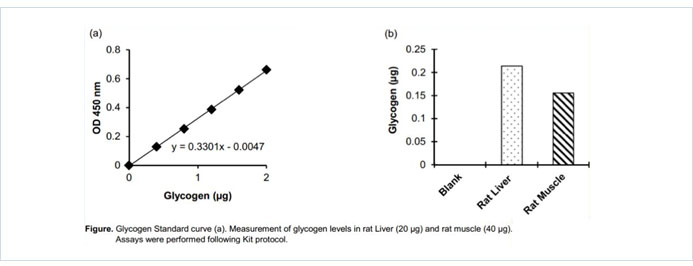 糖原是一种具有支链的生物聚合物,沿着主干每8 – 10个葡萄糖之间按α-1, 4糖苷键缩合失水而成,另有一部分支链通过α-1, 6糖苷键连接。在动物体内作为主要存储的碳水化合物,可稳定地转化为葡萄糖。糖原主要存在于肝脏和肌肉组织。在糖尿病和一些遗传性的糖原沉积病中,糖原无法被正常利用。在本试剂盒中,糖原水解为葡萄糖,氧化形成中间产物,减少将无色的探针转化为有颜色的产物。
