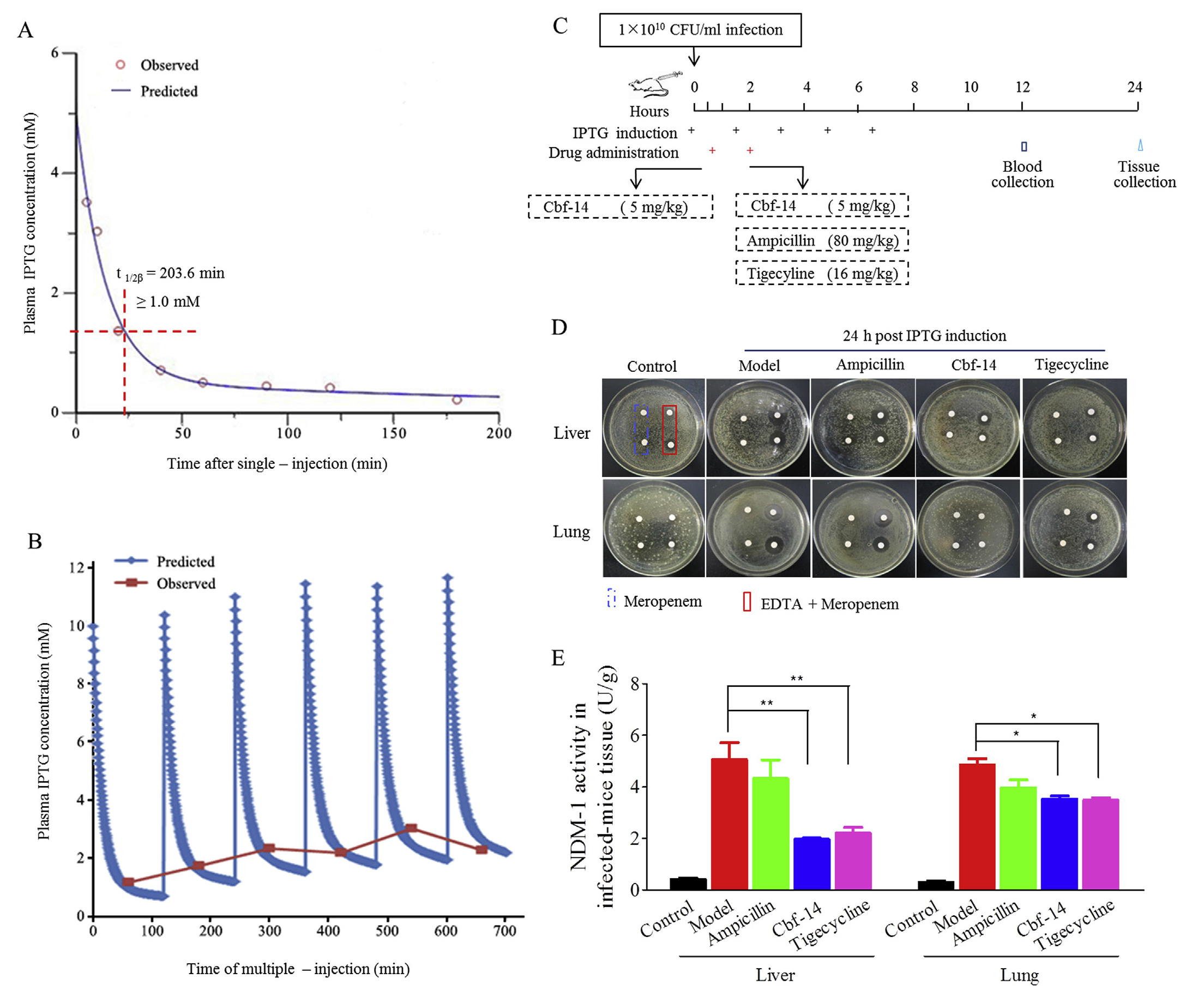 Cbf-14, a cationic peptide derived from a cathelin-like domain, was designed by inserting the highly ahelical sequence RLLR into an antibacterial sequence and deleting the inactive amino acids in Cbf-K16.Clinical penicillin-resistant isolates as well as NDM-1-carrying Escherichia coli and a correspondingly infected mice model were employed to evaluate Cbf-14 antibacterial activity. The results showed that Cbf-14 possessed potent antimicrobial effects with an MIC of 8e64 mg/ml, and killed almost all bacteria within 240 min. Cbf-14-treated mice achieved an 80% survival rate and approximate 2.5 log unit reduction in CFU in tissues; additionally, this peptide significantly suppressed the production of proinflammatory cytokines by the disaggregation of lipopolysaccharide (LPS), suggesting its antiinflammatory effects. Furthermore, Cbf-14, concentration higher than 2 MIC value, increased membrane uptake to NPN and PI dye by 96.2% and 63.7%, respectively, neutralised the negative zeta potential of LPS and bacteria surface, and induced 100% leakage of liposome-entrapped calcein and cytoplasmic membrane disruption of E. coli, indicating obvious membrane permeation. Finally, it bound to DNA and respectively evoked 85.0% and 63.3% inhibition of gene replication and protein expression of NDM-1 at sub-MIC concentration in E. coli BL21 (DE3)-NDM-1. These data indicated that Cbf-14 possessed effective antimicrobial activity against penicillin-resistant bacteria in vitro/vivo through membrane disruption, DNA binding, down-regulating NDM-1 expression by plasmid replication inhibition, and antiinflammatory activity by LPS disaggregation, suggesting a potential anti-infective clinical agent 【完整论文请戳标题】Effective antimicrobial activity of Cbf-14, derived from a cathelin-like domain, against penicillin-resistant bacteria |