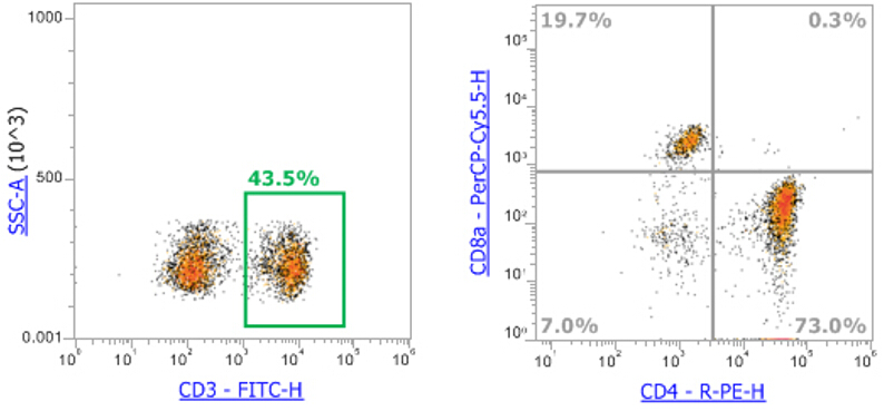 图1. ICR小鼠脾细胞染色 Anti-Mouse CD3ε-FITC/ CD4-PE/CD8α-PerCP-Cy5.5(AMC0702)的结果。已排除黏连细胞。