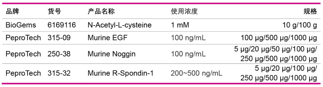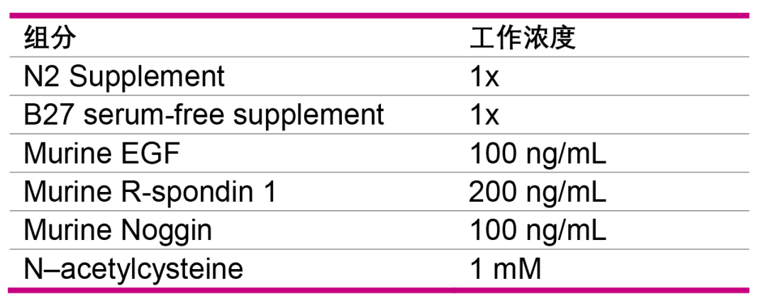 8)小心吸取上清液并使用70 μm滤网过滤,将滤液收集于干净的50 mL管中; 9)重复上述7-8二次,将获得的三份过滤液混合; 10)在2-8 ℃下将上述混合液以290×g离心5分钟。小心地倒出并丢弃上清液; 11)将沉淀重悬于含有10 mLPBS缓冲液中。200×g离心3分钟。轻轻倒出上清液。将肠隐窝沉淀留在管中。根据沉淀量加入适当体积的基础培养基重悬沉淀,如果单细胞过多,可200 r /min 离心2 min 收集上清以去除单细胞; 12)计数,吸取10 μL置于玻璃载玻片或血细胞计数器上。使用倒置显微镜,计数10 μL样本中的隐窝数量,200 g离心5 min,小心吸出并弃去上清; 配 制 类 器 官 培 养 基 在基础培养基中加入: