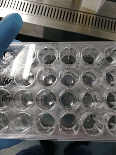 16)使用移液枪沿着孔侧壁向每个孔中轻轻地加入500 μL室温(15-25℃)的配置的类器官培养基。不要将培养基从圆顶结构上直接加入; 17)向其它未接种的孔中加入无菌PBS以保证培养时的湿度。 将培养板的盖子盖好,并在37 ℃和5%CO2下进行培养; 18)观测类器官生长情况。通常,隐窝开始培养约3小时后形成球状结构,通常在培养2至4天后,小肠类器官开始出芽,并且在第5至7天形成复杂的出芽状结构; 19)隔天进行完全换液。换液时将移液枪头放在孔底边缘小心地将原有液体培养基吸出,并加入为500 μL新鲜的室温类器官培养基。