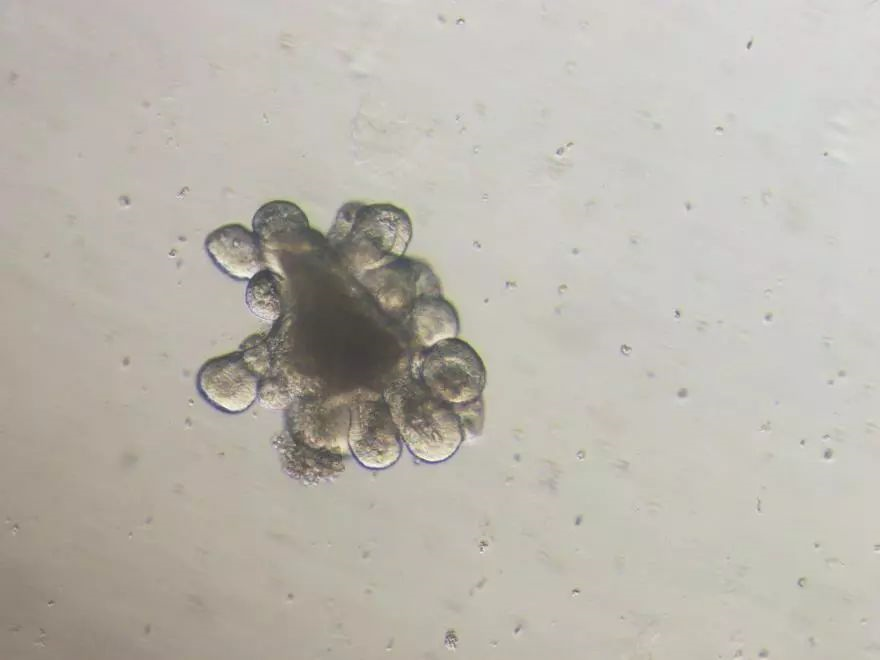 三、小 肠 类 器 官 培 养 注 意 事 项 2)用注射器往肠腔内注入PBS,冲洗掉小肠内容物,可以减少后续洗涤时间; 3)用无菌的载玻片刮去小肠内绒毛组织,尽量去除干净,可以减少杂细胞的产生,另外可以有助于小肠组织的消化,得到更多的小肠隐窝; 4)小肠隐窝消化液用5 mM的EDTA,注意EDTA是否有析出,如析出太多会影响终浓度,有必要更换新的EDTA; 5)因分离小肠隐窝需要时间较久,建议整个操作在低温进行,离心机调至4℃,PBS放冰上。试用移液器前用冷的PBS润洗移液器枪头; 6)EDTA消化后,小肠组织会变松散,在外界机械力作用下,小肠隐窝会从组织中分离出来,可以重复几次通过外界机械力作用得到不同的分馏组分,可以挑选隐窝含量较高,杂细胞较少的分馏组分种板培养; 7)得到分馏组分后进行隐窝计数,用完全培养基重悬隐窝至8~20个/uL,加入等体积基质胶混合,该过程一定要在冰上操作,混合过程切勿产生气泡,否则影响后续观察以及隐窝培养状态,混匀过程可以调小量程,吸取的液体不要全部吹出; 8)购买的基质胶在冰上融化后分装冻存,操作过程中基质胶一定要放在冰上,未用完的液体状基质胶可以冻存,若凝固后请弃去。 9)基质胶种板前需要将培养板放入培养箱温浴30min,拿出培养板后尽快种板,以便形成更好的基质胶圆顶结构。 2)将全部打碎的基质胶悬液冰上放置5~10 min;可用1 mL大枪头继续吹打悬液,此过程避免产生气泡(调制量程到700 μL可避免气泡产生),可取适量的悬液观察,直至看不到大块的类器官团块为止; 注:此过程也可将全部打碎的基质胶悬液吸入胰岛素注射器内,再将悬液通过胰岛素注射器针头打出,通过机械力将类器官团块分离。 传代中,若隐窝状态良好可进行1:3传代,若状态较差可进行1:1传代。全程可以维持约3个月的长期传代扩增,且类器官状态保持良好。