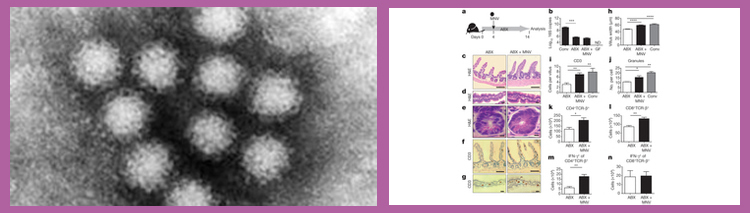 纽约大学史葛柏生物分子医学研究所Ken Cadwell和他的同事发现小鼠诺瓦克病毒murine norovirus (MNV)感染无菌和抗生素处理小鼠能帮助修复缺少细菌的肠内部的形态缺陷,并且提高免疫细胞和信号分子的生产。
