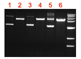 1:pET28a 2:pET28a的EcoR I单酶3:pET30a 4:pET30a的EcoR I单酶切5:pGEX4T1 6:pGEX4T1的EcoR I单酶切 |
