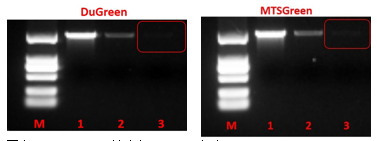 图注:MTSGreen 灵敏度和DuGreen 相当 DNA质量 1.50ng 2:5ng 3:2.5ng