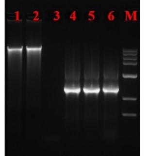 图注:1、2 : 粪便样本DNA提取物4、5 : 1、2 提取物的扩增产物3 :阴性对照 6:阳性对照 |