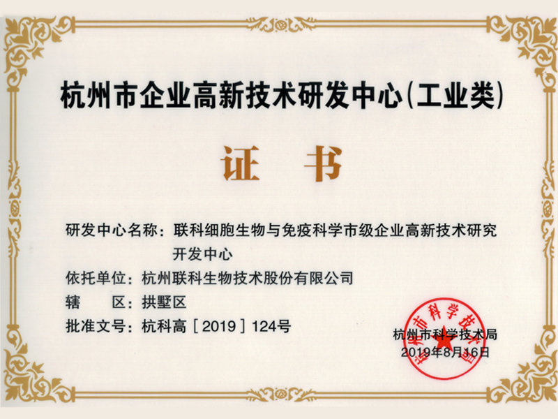 2019年11月,杭州联科生物技术股份有限公司顺利通过杭州市级高新技术企业认定,标志着我司凭借专业的研发队伍、雄厚的技术实力、持续的创新能力、规范的企业管理,在高新技术行业的成就得到杭州市相关部门的肯定与认可。