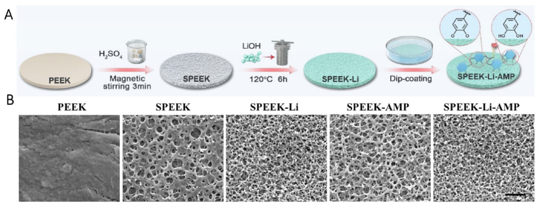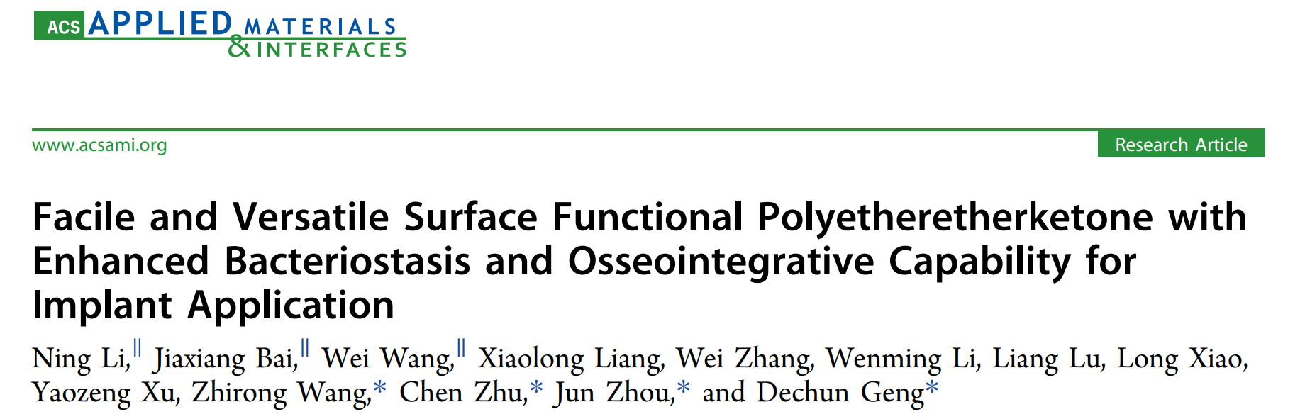 近日,苏州大学附属第一医院骨科在期刊ACS Appl. Mater. Interfaces上发表了题为:Facile and Versatile Surface Functional Polyetheretherketone with Enhanced Bacteriostasis and Osseointegrative Capability for Implant Application的研究论文(IF=9.229)。该团队通过水热处理和贻贝化学的结合,在聚醚醚酮(PEEK)生物材料表面制备了一种锂离子负载(Li+)/贻贝抗菌肽(AMP),可提高骨结合及有效抑制种植体相关感染。