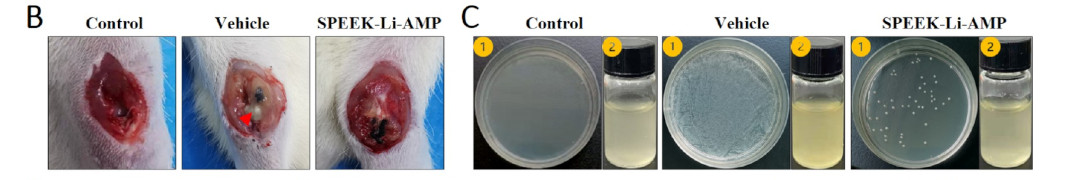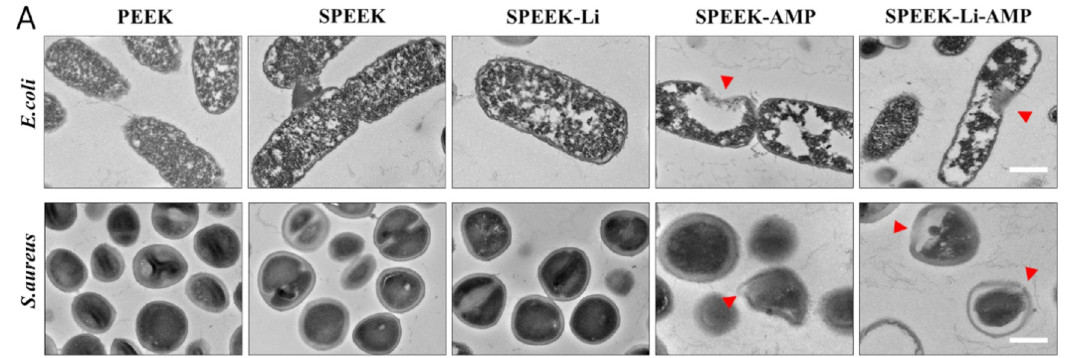 抑菌实验结果进一步证实,SPEEK-AMP和SPEEK-Li-AMP通过破坏菌膜结构,使菌浆在体外流出,可有效杀灭金黄色葡萄球菌和大肠杆菌。