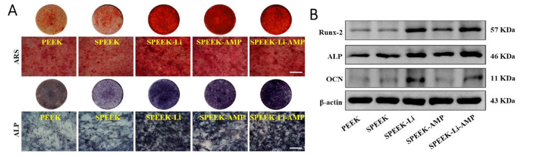 氯化锂可调节骨髓间充质干细胞的成骨分化,增加骨量形成。为了进一步研究锂离子对骨髓间充质干细胞分化的影响,研究团队评估了成骨细胞相关基因和蛋白的表达。与其他组相比,SPEEK-Li和SPEEK-Li- amp组成骨相关基因和蛋白,如ALP、OCN和Runx-2的表达增加,提示Li+的释放促进骨髓间质干细胞成骨分化。