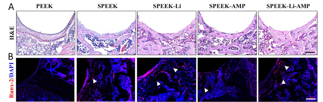感染模型的体内实验表明,多功能PEEK植入物的杀灭细菌的效率为95.03%。此外,在大鼠股骨体内,SPEEK-Li和SPEEK-Li- amp组间的新骨形成数量显著增加。