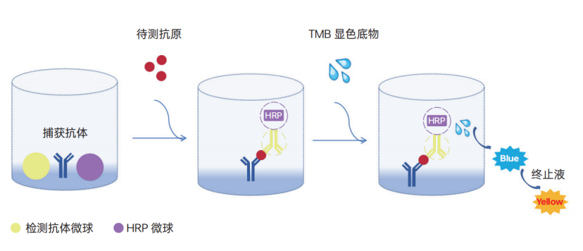 本试剂盒采用双抗体夹心酶联免疫吸附检测技术。特异性捕获抗体预包被在高亲和力的酶标板上,酶标板孔中预先加入HRP标记的检测抗体微球。酶标板孔中加入标准品和待测样本,经过孵育,样本中存在的待测物质与捕获抗体和检测抗体结合。洗涤去除未结合的物质后,加入显色底物(TMB),避光显色。颜色反应的深浅与样本中待测物质的浓度成正比。加入终止液终止反应,在450nm波长(参考波长570或630nm)测定吸光度值。