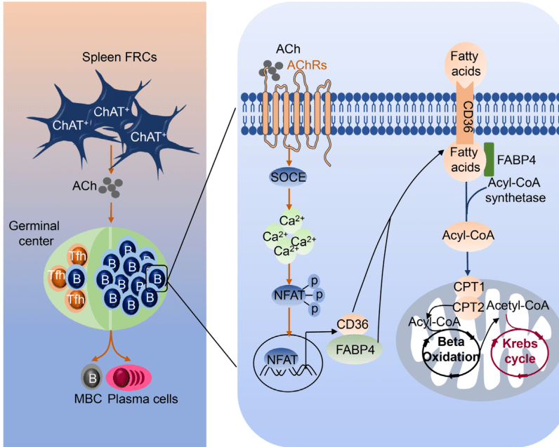 Qin Zeng, Shuyi Wang, Niansheng Yang, Hui Zhang. Spleen fibroblastic reticular cell-derived acetylcholine promotes lipid metabolism to drive autoreactive B cell responses. Cell Metabolism. April 04, 2023.