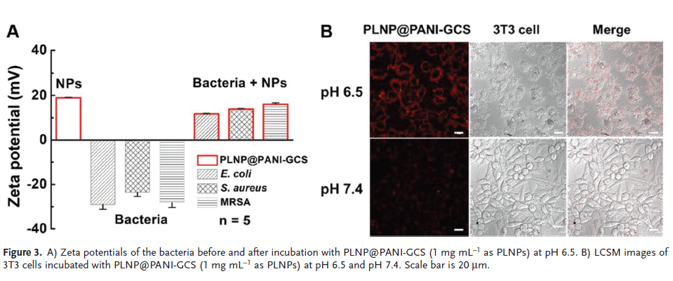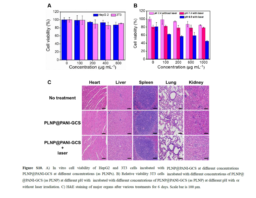 该文成功构建了一种核-壳纳米结构:PLNP@PANI-GCS。用于对细菌感染的精确光热治疗,且可无荧光持续发光成像。开发的PLNP@PANI-GCS纳米平台集成了红光LED光可再生长余辉、pH依赖的光热转换特性、pH响应的表面电荷跃迁等优点,保证了808 nm激光辐照直接对细菌感染部位的精确加热。该纳米平台对酸性细菌感染区有特异性,但对正常组织无损伤。重要的是PLNP@PANI-GCS纳米平台不含抗生素,在治疗多药耐药细菌感染方面具有很大潜力,不存在微生物耐药性问题。考虑到细菌感染区域与正常组织微环境的差异,我们认为激活光热策略可以进一步开发更智能的靶向杀菌平台。