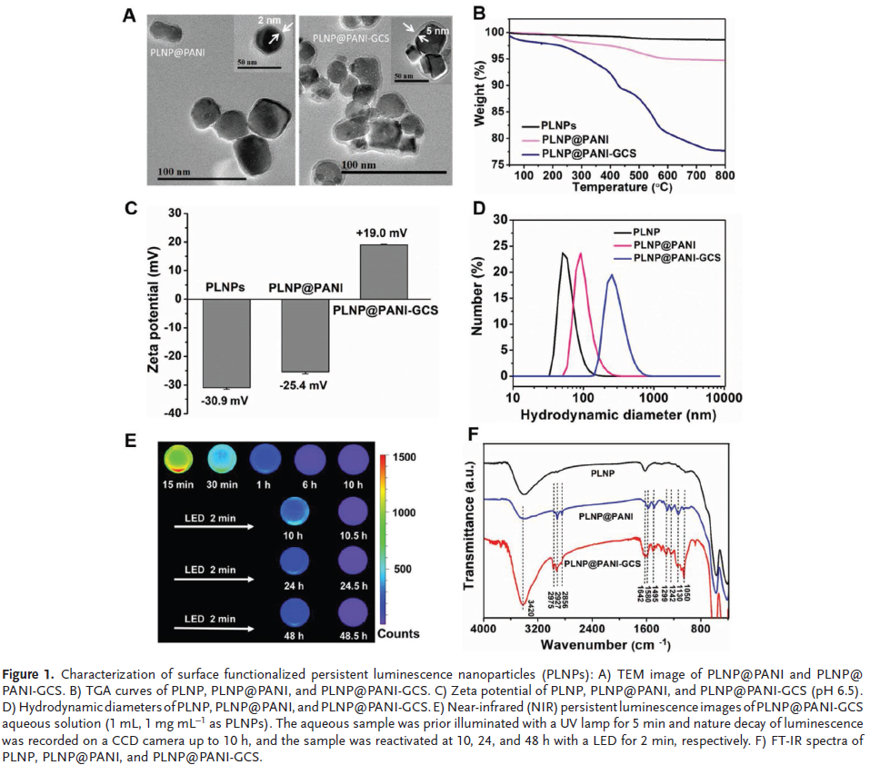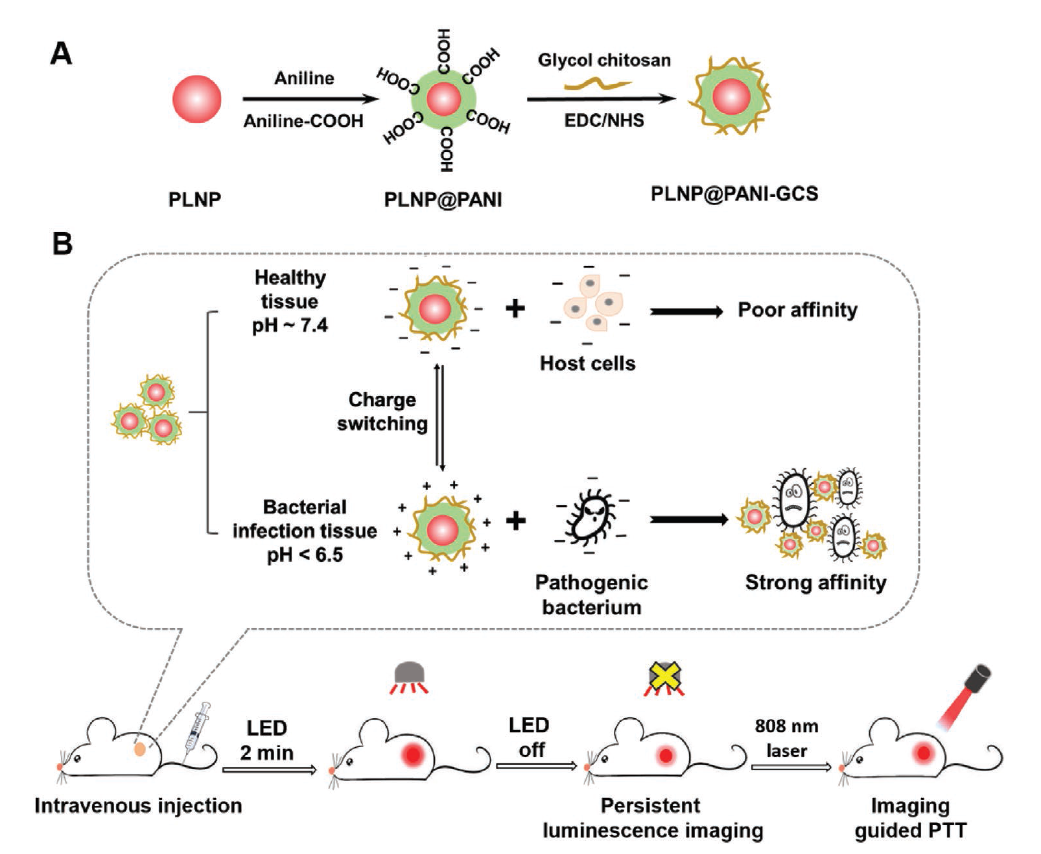 作者设计并构建了以掺杂Cr3+的PLNP为内核,通过原位氧化聚合包覆以PANI,并通过酰胺化反应结合GCS的纳米系统。对该系统进行了一系列特性检测,随后对治疗功能进行了体外验证,最后在小鼠体内进行了体内功能验证。下图图示了纳米材料PLNP@PANI-GCS的构建过程以及用于细菌感染的光热治疗步骤。
