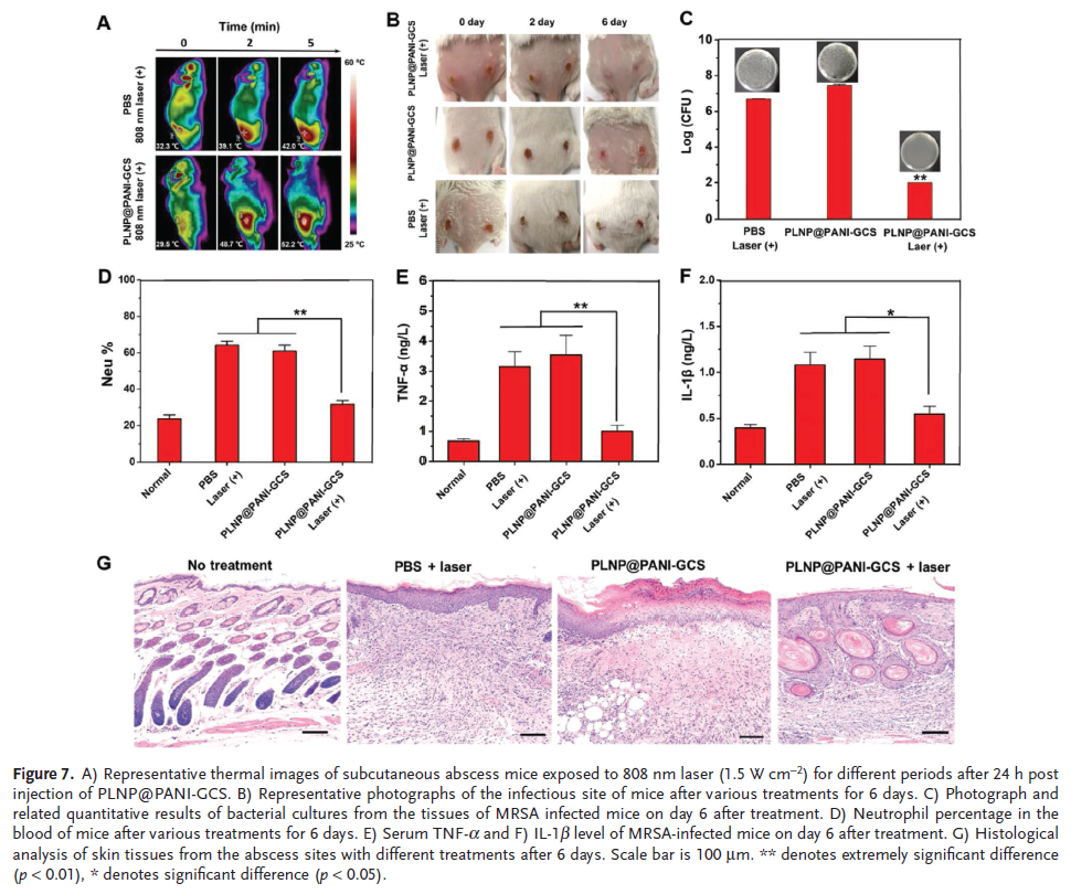 将耐甲氧西林金黄色葡萄球菌(MRSA)感染构建的模式小鼠随机分为4个治疗组(PBS/激光,PLNP@PANI-GCS,PLNP@PANIGCS/激光,空白对照),评价PLNP@PANI-GCS的体内光热治疗性能血液中中性粒细胞百分率、血清TNF-α和IL-1β水平显著降低,且与健康小鼠无统计学差异(图7D-F),证实PLNP@PANI-GCS/激光照射组小鼠恢复良好。