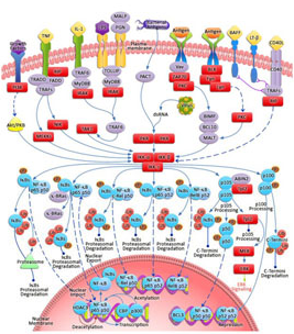 NF-κB (核因子活化B细胞κ轻链增强子)是调控DNA转录的蛋白复合物,存在于几乎所有类型的动物细胞中,参与细胞对刺激物(如压力、细胞因子、自由基、紫外辐射、氧化低密度脂蛋白、细菌或病毒抗原等)产生应答。最近发现NF-κB与癌症、炎症、自身免疫疾病、感染性休克、病毒干扰和不合适的免疫发育相关。因此NF-κB可作为药物治疗的靶点。 |