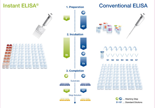 | MedSystems Instant ELISA® Instant ELISA™即一步法ELISA,是Bender公司在常规ELISA的基础上开发的更简便、更精确的快速ELISA产品,它大大减少了操作步骤和缩短的操作时间。让同时测定96个样品成为可能,降低了失误的几率,且提高了实验的精确性。 Instant ELISA™的优势: 1)简化了复杂的操作步骤 由传统的17步操作简化到7步操作,只需1步孵育步骤,无需稀释生物素标记的抗体和streptavidin-HRP,无需倍比稀释标准品。 2)大大缩短了实验的时间: 与常规ELISA相比,缩短了将近1个小时。 3)实验结果更加精确 标准曲线是ELISA中最重要的一个环节,标准品的保存和稀释也是一大难题,bender公司率先将不同浓度的标准品以冻干粉形式冻干于微孔中,将吸量误差降至最低。 Instant ELISA™与常规ELISA对比: 如何避免高CV值 ? 从-20℃取出酶标板时尽快使用,避免因放置在外面时间过长,造成酶标板 吸水 ? 加水到样品孔,等到样品孔中试剂完全溶解后再添加样品 ? 无需来回吹吸混匀,防止孔中试剂粘附在枪头上,导致高CV值 ? 洗板时每孔中加入不少于400 µl的洗涤液,以保证孔壁无试剂残留,洗涤液在孔中保留15秒 ? 移开标准品封板膜时防止溶液溅出 |