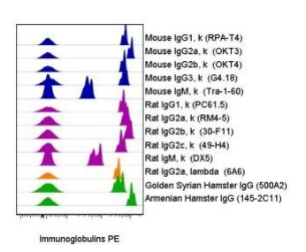 做多色分析的研究人员越来越多,很多指标的表达都不足以用来调节补偿,而补偿微球无论是在机器自动调节和手动调节上都是绝佳的工具。该补偿微球可应用于多个种属,各种亚型和轻链,价格又相对便宜。绝对是性价比最高的首选! ? 产品目录号: cat# 01-1111 规格:100 tests ? 使用方便,一滴即可 ? 与所有小鼠、大鼠和仓鼠来源的抗体反应,无论它们的轻链是 kappa 还是 lambda ? 适用于各种激发光* 适用于 488 nm 蓝光, 532 nm 绿光, 561 nm 黄光, 633-635 nm 红光, 应用于 405nm 紫光的荧光素中只对 eFluor® 450 进行过优化