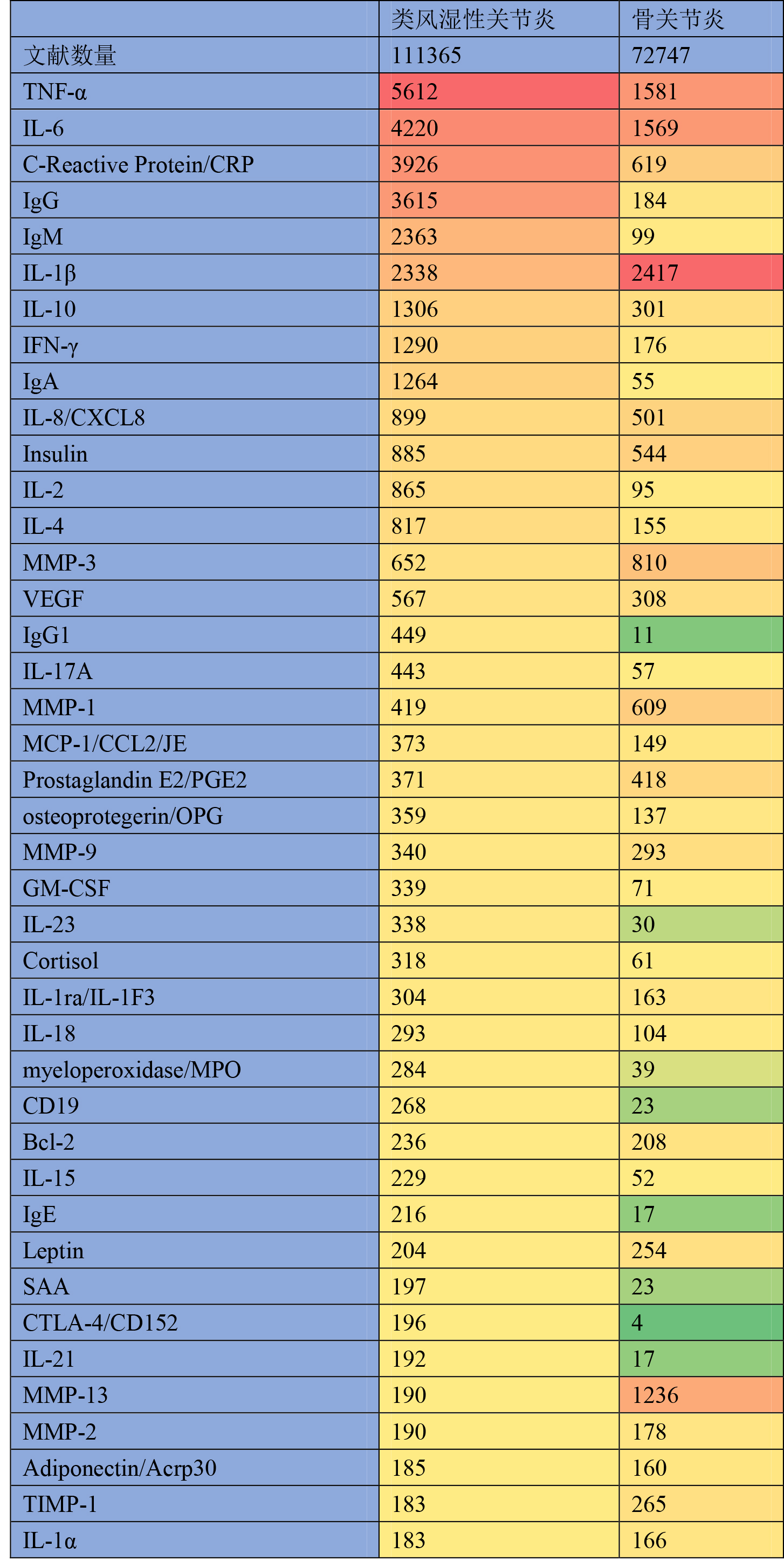 1 主要骨关节炎疾病类型介绍 类风湿性关节炎是一种自身免疫性疾病。早期的类风湿性关节炎往往首先影响到你的小关节,随着病情的发展,症状往往蔓延到手腕、膝盖、脚踝、肘部、臀部和肩膀,最终导致骨侵蚀和关节畸形。在大多数情况下,症状发生在身体两侧的同一个关节。 类风湿性关节炎的症状和体征可能包括:关节疼痛,肿胀,发热;关节僵硬,通常在早晨和不活动后更严重;疲劳、发烧和食欲不振。类风湿性关节炎不仅影响关节,还会损害多种身体系统,包括皮肤、眼睛、肺、心脏和血管。大约40%的类风湿性关节炎患者也有不涉及关节的体征和症状。 类风湿性关节炎的症状和体征可能严重程度不同,甚至会反复。疾病活动增加的时期与相对缓解的时期(肿胀和疼痛消退或消失)交替出现。随着时间的推移,类风湿性关节炎会导致关节变形和移位。 可能增加类风湿性关节炎风险的因素包括: • 性别,女性比男性更容易患类风湿性关节炎。 • 年龄,类风湿性关节炎可以发生在任何年龄,但它最常开始于中年。 • 家族史,如果你的家庭成员患有类风湿性关节炎,你可能会增加患病的风险。 • 吸烟,吸烟会增加患类风湿性关节炎的风险,特别是当有患这种疾病的遗传倾向的时候。 • 超重,超重的人患类风湿性关节炎的风险似乎更高。 类风湿性关节炎会增加患上以下疾病的风险: • 骨质疏松症 • 类风湿结节 • 眼睛和嘴巴干燥,患者更容易患干燥综合征 • 感染 • 身体成分异常:类风湿性关节炎患者的脂肪与体重的比例通常更高,即使是那些体重指数(BMI)正常的人。 • 腕管综合征 • 心脏问题:类风湿性关节炎会增加动脉硬化和阻塞的风险,以及心包炎。 • 肺病:类风湿性关节炎患者肺部组织炎症和瘢痕形成的风险增加,从而导致进行性气短。 • 淋巴瘤。 骨关节炎是一种退行性疾病,软骨垫退化,常被称为磨损性疾病。随着时间的推移而恶化,常常导致慢性疼痛。如果软骨完全磨损,骨头会在骨头上摩擦。但是除了软骨的破坏,骨关节炎影响整个关节。它会引起骨骼的变化和连接关节和肌肉与骨骼的结缔组织的退化。它还会导致关节衬里发炎。 骨关节炎的症状往往发展缓慢,并随着时间的推移恶化。骨关节炎的症状和体征包括:容易在运动中受伤;对关节或附近稍微挤压,便会感到疼痛;关节僵硬,失去灵活性,活动受限;用到关节时有刺痛感,可能会听到爆裂声;有骨刺;关节周围肿胀等。 可能增加骨关节炎风险的因素包括: • 年龄,患骨关节炎的风险随着年龄的增长而增加。 • 性别,女性更容易患骨关节炎。 • 肥胖,额外的体重在很多方面会导致骨关节炎,体重越重,风险越大。高体重增加了负重关节的压力,比如臀部和膝盖。此外,脂肪组织产生的蛋白质,可以导致炎症。 • 关节损伤会增加患骨关节炎的风险。即使是多年前发生的看起来已经痊愈的损伤也会增加患骨关节炎的风险。 • 关节反复受力。如果你的工作或运动对关节造成了反复的压力,那么最终可能会发展成骨关节炎。 • 遗传。 • 骨畸形。有些人天生关节畸形或软骨有缺陷。 • 某些代谢性疾病,其中包括糖尿病和身体含铁过多(血色素沉着症)。 类风湿性关节炎和骨关节炎在关节处病变情况图示如下(图1)。 还有一种称为风湿性关节炎的疾病,易与类风湿性关节炎混淆。风湿性关节炎一般与链球菌感染有关,呈游走性,多侵犯大关节,一般不会导致关节畸形,但容易合并心脏、皮肤及脑部病变。风湿性关节炎属于变态反应性疾病。血象白细胞常常是增高的。抗“O”检查结果强阳性。 风湿性关节炎和类风湿性关节炎的主要不同点是所累及的关节不同。风湿性关节炎主要累及大关节,而类风湿性关节炎主要累及小关节,如掌指关节、外关节、跖趾关节等。它们的发病原因也是不一样的,风湿性关节炎主要与溶血性链球菌感染有关,而类风湿性关节炎主要与自身免疫功能失调有关。 二、 类风湿性关节炎及骨关节炎相关因子 以我们已有ELISA试剂盒的指标名称和疾病名称“Rheumatoid arthritis”/“Osteoarthritis”为关键词,在Pubmed的title/abstract下搜索,得各指标文献数量。对文献数较多的指标列于下表2.,并以红-黄-绿色阶标注文献数量的多少,更直观地表示不同指标在两种疾病中受关注的程度。 以上指标,联科生物均已开发ELISA试剂盒,质控严格。欢迎选购! 主要参考资料:梅奥医学 https://www.mayoclinic.org/diseases-conditions/osteoarthritis/symptoms-causes/syc-20351925 https://www.mayoclinic.org/diseases-conditions/arthritis/symptoms-causes/syc-20350772 https://www.mayoclinic.org/diseases-conditions/rheumatoid-arthritis/symptoms-causes/syc-20353648 |