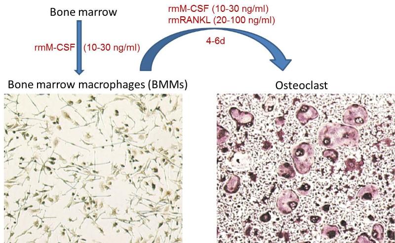 由前体细胞到破骨细胞需要 RANKL来掌控,而M-CSF能够促进分化过程中细胞的存活,骨髓来源的巨噬细胞 (BMM)向破骨细胞分化的过程中需要M-CSF和RANKL两种细胞因子的刺激,BMM表面受体RANK与c-fms可分别与成骨细胞等细胞产生的细胞因子RANKL和M-CSF结合,促使其向破骨细胞分化,另外成骨细胞还可以分泌OPG, 作为一种诱饵受体,竞争性与RANKL结合从来阻止RANKL和RANK结合来调节破骨细胞的生成。