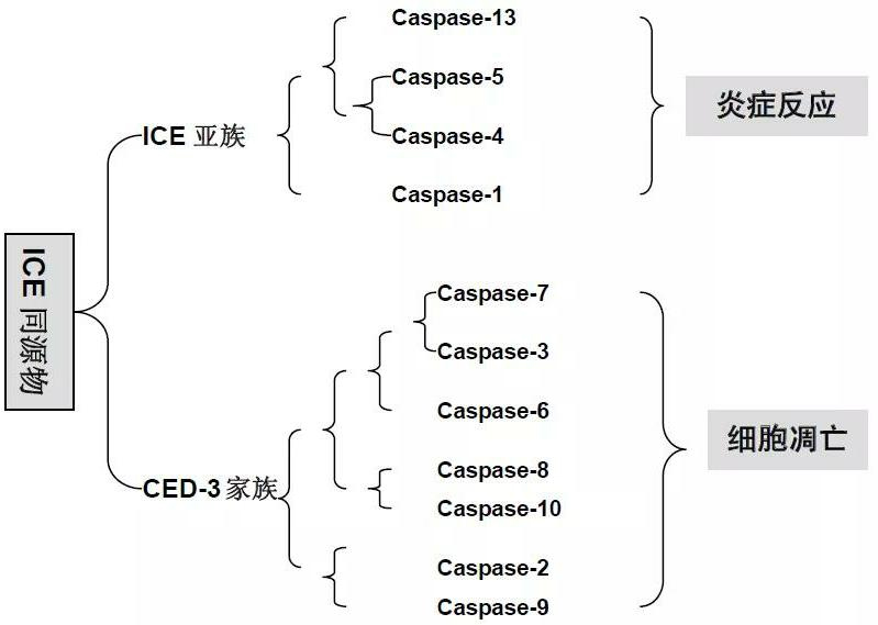 - ICE亚族:包括Capsase-1,Caspase-4,Caspase-5和Caspase-13,参与炎症反应。