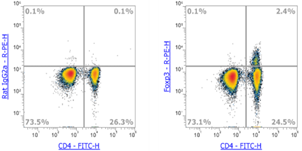 图. 人抗凝血染色Anti-Human CD4, FITC (AH00401)和Rat IgG2a Isotype Control, PE (Cat No. CRG2a04) (左)和Anti-Human CD4, FITC (AH00401)和Anti-Human Foxp3, PE (右)的结果。已排除黏连细胞。