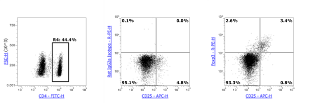 使用Human Regulatory T Cell Staining Kit进行流式检测。人抗凝血染色FSC/CD4 (左), CD25/大鼠IgG2a同型对照, PE (中)和CD25/FoxP3(右)。粘连细胞已被排除。实验在Thermo Fisher公司的Attune NxT流式细胞仪上进行。