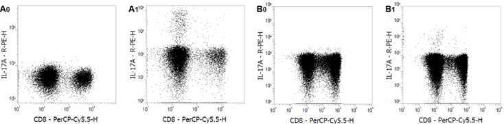 Flow cytometric analysis of Human Th17 Staining Kit. The staining pattern of IL-17A on resting heparin anticoagulated blood (A0) and PBMCs from EDTA anticoagulated blood (B0). PMA/Ionomycin stimulated heparin anticoagulated blood (A1) and PBMCs from EDTA anticoagulated blood (B1). Dot plot analysis are derived from gated CD3+/CD8- cells population. Flow cytometry was performed on a Thermo Fisher Attune NxT. The health status of the volunteers is unclear.