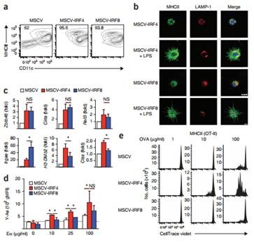 17.IRF4在DC细胞抗原递呈中的关键作用CD11b+的DC细胞通过其MHCII分子执行抗原递呈功能,活化CD4 T细胞。美国科研人员通过染色质免疫共沉淀(ChIP)发现转录因子IRF4在DC发育及其执行抗原递呈功能过程中发挥关键作用,而其同源分子IRF8则没有相似功能。Vander Lugt B, Khan AA, Hackney JA, et al. Transcriptional programming of dendritic cells for enhanced MHC class II antigen presentation. Nat Immunol. 2014, 15(2):161-7.