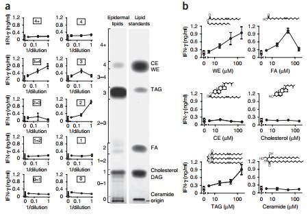 CD1a作为非经典MHC分子能在血液和皮肤中递呈自身抗原,从而活化自身反应性T细胞。但人们不清楚这些抗原具体是什么,哈佛大学科研人员最近发现,皮肤上一些非极性油脂分子是CD1a递呈的抗原,这位免疫屏障研究指明了新的方向。de Jong A, Cheng TY, Huang S, et al. CD1a-autoreactive T cells recognize natural skin oils that function as headless antigens. Nat Immunol. 2014, 15(2):177-85.