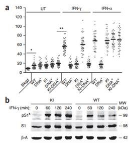 STAT1在I/II型干扰素的产生中都发挥关键作用,但尚不清楚STAT1在两条通路中的作用机制是否相同。英国科研人员通过基因修饰小鼠发现,STAT1与DNA的结合是其活化II型干扰素所必须的,而I型干扰素的产生并不依赖这种结合。Begitt A, Droescher M, Meyer T, et al. STAT1-cooperative DNA binding distinguishes type 1 from type 2 interferon signaling. Nat Immunol. 2014, 15(2):168-76.