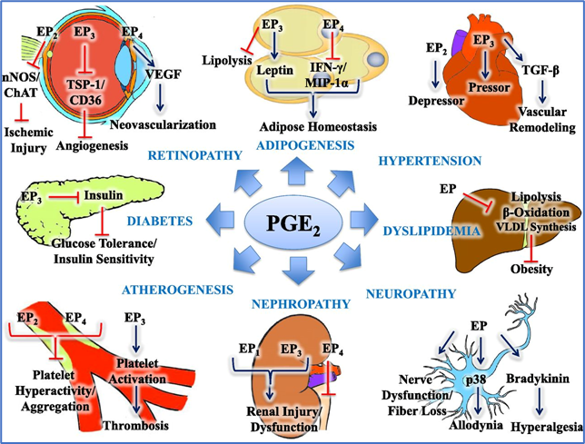 血脂异常:PGE2还抑制肝脏的脂分解、β-氧化和极低密度脂蛋白(VLDL)的合成,但EP受体的性质尚不清楚。