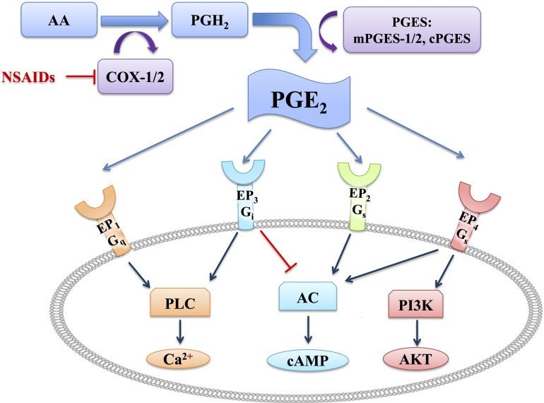 (一) PEG2合成途径及信号途径如下图1。磷脂酶A2(PLA2)催化膜磷脂释放花生四希酸(Arachidonic acid,AA),AA由环氧化酶(Cyclooxygenase, COX,包括COX-1和COX-2)转化为PGH2。然后由PGE合酶(mPGES-1、mPGES-2和cPGES)催化产生PGE2。PGE2通过与G蛋白偶联受体EP1-EP4结合发出信号。激活EP1(偶联到Gq)通过磷脂酶C(PLC)增加细胞内Ca2+浓度。激活EP3(偶联到Gi)通过PLC增加细胞内Ca2+和/或通过腺苷酸环化酶(AC)抑制cAMP的产生。激活EP2或EP4(两者都与Gs偶联)通过AC刺激cAMP的产生,EP4的激活也通过刺激磷酸肌醇3激酶(PI3K)增加蛋白激酶B(AKT/PKB)。