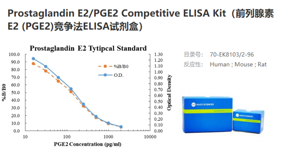 神经病变:PGE2通过未知的EP受体参与神经病变,包括促进神经功能障碍/纤维丢失、痛觉超敏(通过p38)和痛觉过敏(通过缓激肽)。肾病:PGE2通过EP1和EP3导致肾损伤和功能障碍,而EP4可预防肾损伤和肾功能不全。动脉粥样硬化形成:PGE2也有助于动脉粥样硬化形成,EP2和EP4抑制血小板过度活跃和聚集。相反,EP3促进血小板活化增加血栓形成的风险。糖尿病:PGE2通过抑制胰岛素分泌,导致糖耐量和胰岛素敏感性受损,从而导致糖尿病。视网膜病变:前列腺素e2通过抑制神经元型一氧化氮合酶(nNOS)和胆碱乙酰转移酶(ChAT)参与眼缺血损伤。EP3通过抑制血小板反应蛋白1(TSP-1)和CD36(分化簇36)参与眼部血管生成。EP4通过刺激血管内皮生长因子(VEGF)促进眼部新生血管形成。纤维化:(a) PGE2通过增加磷酸酶和张力素同系物(PTEN)活性来阻断前生存蛋白激酶B/AKT,从而抑制成纤维细胞增殖。(b) PGE2通过磷酸化VASP但对Cofilin1去磷酸化,干扰血清反应因子(SRF)/心肌相关转录因子-A(MRTF-A)复合物的形成,进而抑制α-平滑肌肌动蛋白(αSMA)的转录激活。(c) PGE2通过平衡基质金属蛋白酶(MMP)/金属蛋白酶组织抑制剂(TIMP)的表达来控制胶原蛋白的生成。(d) PGE2通过诱导Ras抑制剂(RIN1)磷酸化,阻止TGF-β诱导的Ras/Raf依赖性成纤维细胞迁移。肿瘤:COX-2的过度表达导致PGE2水平升高,尤其与结肠直肠癌,胰腺癌、肺癌和乳腺癌有关。癌细胞接触诱导癌相关成纤维细胞(CAF)来源的PGE2或其他来源的PGE2诱导癌细胞侵袭。PGE2通过刺激血管生成、细胞侵袭和转移参与肿瘤进展,并通过多种信号途径抑制凋亡来促进细胞存活。此外,PGE2在肿瘤逃避免疫监视方面也有作用,并且已知可改变树突状细胞(DC)的细胞因子表达谱,以抑制抗肿瘤细胞毒性T细胞。分泌PGE2的癌细胞已被证明能诱导人Treg细胞的形成,并增强其对肿瘤特异性Th细胞的抑制活性。炎症:PGE2在炎症领域的作用最为多样。在过去的几十年里,使用COX-2、m-PGES1和EP受体基因敲除小鼠的研究获得了新的重要发现,证明了前列腺素既有促炎作用,也有抗炎作用,而且这些作用通常是通过定向调节相关组织中的基因表达而产生的。前列腺素E2通常是一种重要的促炎介质,参与炎症的所有主要体征:水肿、发红、肿胀和疼痛。PGE2对免疫细胞类型的影响要复杂得多。PGE2除了有助于炎症的产生外,还被证明有利于DC成熟、抗原摄取和归巢到淋巴结。此外,还证明PGE2可诱导DC上共刺激分子的表达,从而增强T细胞的活化。在巨噬细胞中,PGE2通过调节细胞内环磷酸腺苷(cAMP)水平,在IFN-γ和TNF-α激活巨噬细胞中起到积极的辅助作用。它也被证明是巨噬细胞中基质金属蛋白酶MMP-2和MMP-9的诱导剂。有大量的报告支持PGE2也作为一种消炎分子抑制免疫反应的观点。PGE2已被证明能抑制Th1分化、B细胞功能、T细胞活化和过敏反应。此外,PGE2还可对中性粒细胞、单核细胞和自然杀伤细胞等天然免疫细胞发挥抗炎作用。在过去的十年里,PGE2作为一种T细胞免疫抑制剂的前景发生了革命性的变化,这是由于不同的报道证实了PGE2在T细胞分化和免疫功能方面的有益作用。前列腺素E2(PGE2)是类风湿性关节炎和骨关节炎等疾病的主要炎症介质。 联科生物,ELISA新品不断,最近推出了PGE2 ELISA Kit,在人、小鼠、大鼠中都做了验证。质优价廉,欢迎垂询! 本文主要摘自: