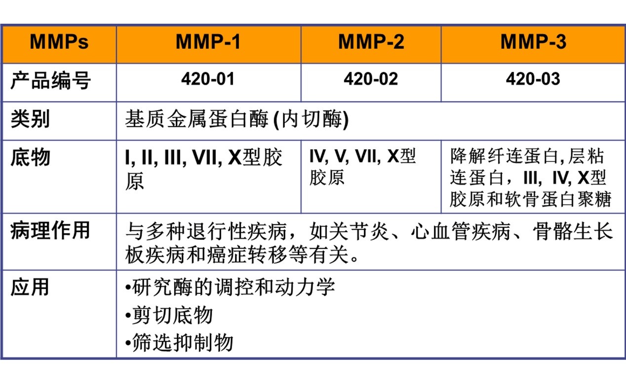 外肽酶也叫肽链端解酶,或端解酶,是蛋白水解酶一类,可催化多肽链末端肽键水解,游离末端氨基酸。PeproTech现有的外肽酶产品如下。 大鼠羧肽酶-B常与胰蛋白酶一起用于胰岛素生产,由胰岛素原转化为胰岛素的过程中。 内肽酶水解底物主要为蛋白质中间部分的肽建。目前我们公司的内肽酶产品主要有丝氨酸內肽酶、基质金属蛋白酶。 GrB(颗粒酶)是一种丝氨酸蛋白酶,是在细胞毒性T淋巴细胞和自然杀伤细胞的胞浆颗粒中发现的。 初期的研究主要认为GrB参与诱导体外的细胞裂解,DNA片段化和染色体聚集。 GrB剪切天冬氨酸残基的能力,在真核丝氨酸蛋白酶中是很独特的。GrB其他的底物还有ICAD / DFF45、PARP、DNA-PK、α-微管蛋白、ROCK-1、lamin B和NUMA。 GrB可以在体内外蛋白水解激活许多caspase蛋白。通过caspase依赖和非依赖的机制来激活细胞的凋亡。 人的GrB可以蛋白水解活化Bid蛋白,使其转运到线粒体外膜并促进Bax/bak分子寡聚化。小鼠中,GrB可能无法有效地活化Bid。 人肠激酶特异性识别DDDDK,可以用于除去融合蛋白的FLAG标签(DYKDDDDK)。 基质金属蛋白酶(MMP)基质金属蛋白酶是一个大家族,因其需要Ca、Zn等金属离子作为辅助因子而得名。MMPs主要由巨噬细胞、中性粒细胞、平滑肌细胞(SMCs)、内皮细胞等产生。这类酶在细胞外基质(ECM)的维持和重塑中发挥重要作用。 1962年Gross首次发现在蝌蚪尾巴退化过程中含有一种间质蛋白酶(MMP-1)。按发现的顺序MMPs家族已命名至MMP-28,其中在人类中发现有24种。 MMPs主要由巨噬细胞、中性粒细胞、平滑肌细胞(SMCs)、内皮细胞等产生。除巨噬细胞和中性粒细胞外,MMPs是不储存在细胞内的。当有外来特定信号刺激这些细胞时,MMPs合成增加并立即分泌到细胞外基质中去。 根据MMPs作用底物、分子结构可分为7组:(1)胶原酶:包括MMP-1、MMP-8、MMP-13。其主要水解底物是纤维类胶原,即I、II、III型胶原。
