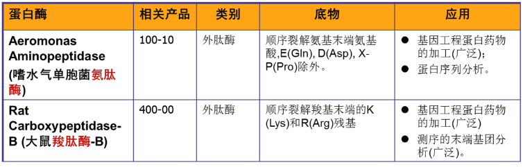 应用:如利用嗜水气单胞菌氨肽酶除去人生长激素,猪生长激素,牛生长激素类似物的N末端氨基酸残基,从而产生具有天然氨基酸序列的蛋白质。