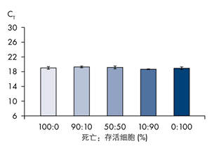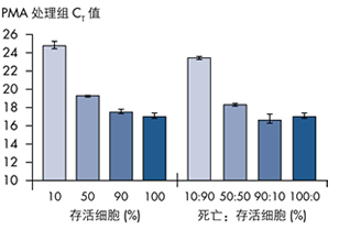 PMA 选择性抑制死亡细胞 DNA 的检测 当使用存活和死亡微生物的混合样本时,PMA 可选择性地抑制对死亡细胞的检测,而不会对存活细胞 DNA 的检测造成影响(图 5)。样本中的死亡细胞不会影响 PMA 的性能。因此可确信,所得到的结果能够精确反映样本中的存活微生物。