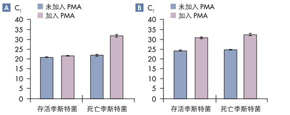 PMA 对存活和死亡细胞具有高效的分辨能力 PMA 选择性地进入死亡细胞,由光激活进而嵌入 DNA 并与之共价结合,从而在后续 PCR 中强烈抑制扩增反应。由死亡细胞 DNA 获得的 CT 信号显著高于存活 DNA,据此实现存活和死亡细胞的明确区分(图 4)。