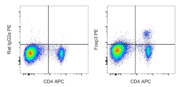 以大鼠血液淋巴细胞设门进行分析的结果示例(需要配合使用Transcription Factor Fixation/Permeabilization Buffer),左图为Anti-Rat CD4, APC和Rat IgG2a,κ, PE染色结果,右图为Anti-Rat CD4, APC和Anti-Rat Foxp3, PE染色结果。