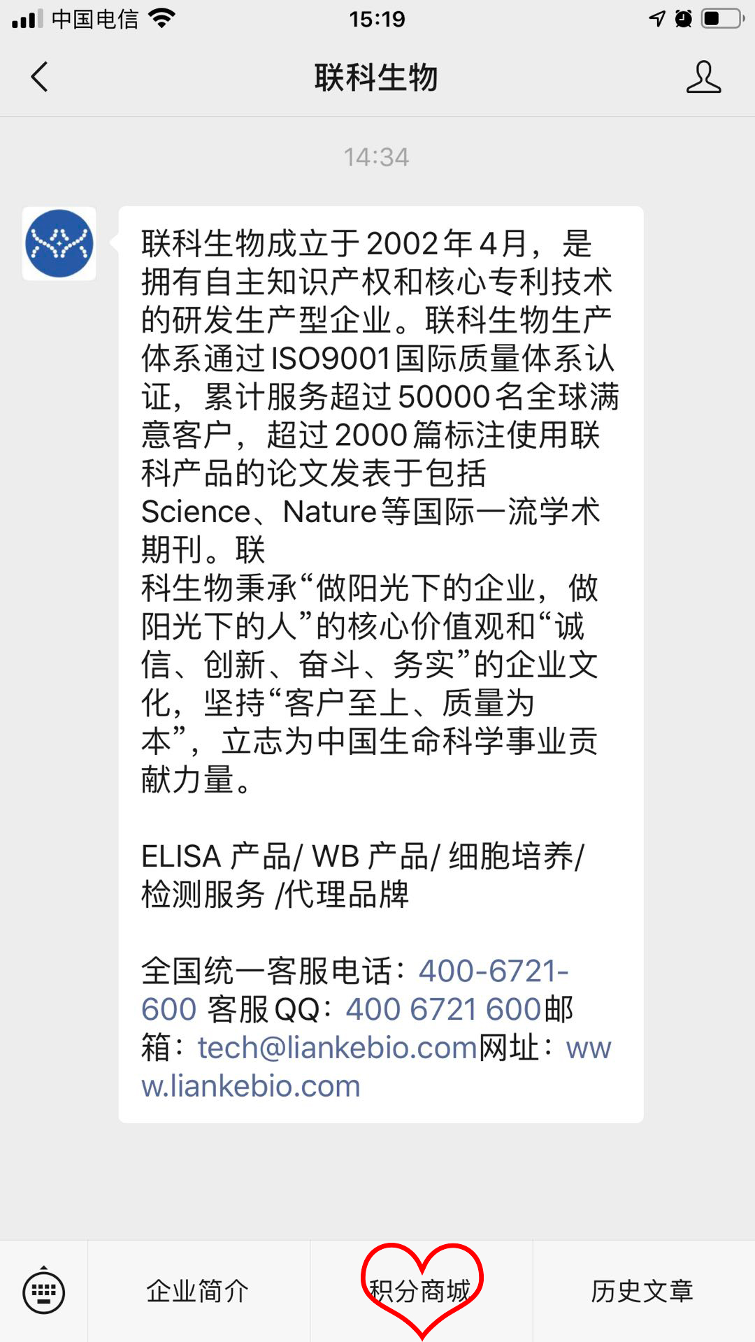 | 关注“联科生物”微信公众号 | 点击微信菜单栏底部“积分商城” | 点击首页焦点图 —— 准确填写信息提交报名 |