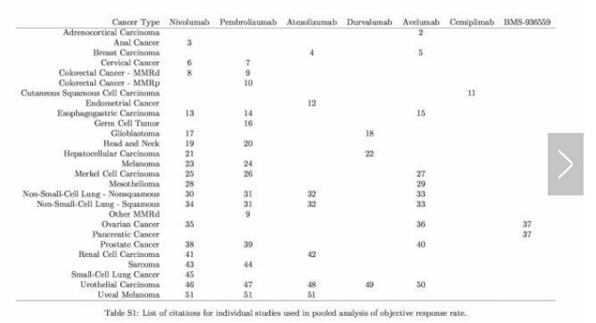 研究者通过广泛的文献搜索,确定了27个肿瘤类型/亚型可用的客观有效率数据。对于每种肿瘤类型,作者汇集了已发表的大型研究中评估客观缓解率的数据。这是指在研究中纳入至少10名患者未被以PD-L1表达水平作为标准去选择使用anti–PD-1或 anti–PD-L1 单一疗法。具体指的是仅研究与其他药物组合的抗PD1疗法的研究,以及基于PD-L1表达或其他免疫相关生物标志物选择患者的研究。在其余的研究中,只有每个抗PD1治疗的最大的研究会被纳入最终评估每种癌症类型或亚型的合并ORR。 研究者以nivolumab,BMS-936558, pembrolizumab, MK-3475, atezolizumab, MPDL3280A, durvalumab, MEDI4736, avelumab, MSB0010718C, BMS-936559, cemiplimab 和 REGN2810这些关键词检索临床实验,在已经进行了任何抗PD1治疗的3期临床研究的肿瘤类型中,也排除了招募患者数目少于40名的研究,或使用其他抗PD1抑制剂的dose-finding studis研究。