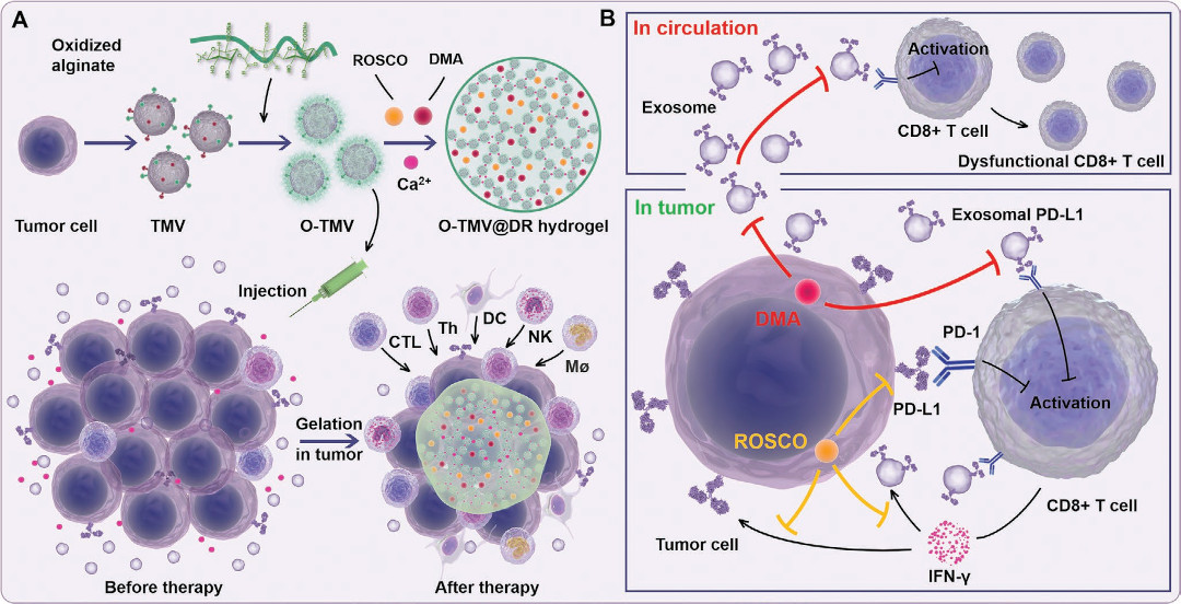 程序性死亡-1配体(PD-L1)在肿瘤发展中起关键作用。细胞表面的PD-L1直接与肿瘤浸润淋巴细胞(TILs)上的程序性死亡-1 (PD-1)相互作用,从而抑制它们的抗肿瘤活性。但是,干扰抑制的免疫检查点疗法在临床病例中的治疗效果有限。目前针对基于PD - L1的疗法局限于肿瘤部位的局部调控,忽视了全身免疫抑制因素。PD-L1也存在于肿瘤细胞的外泌体表面,可与外泌体一起在全身游走,结合T细胞,从而导致免疫抑制。显然,免疫检查点疗法的疗效依赖于同时降低肿瘤PD-L1和循环外泌体PD-L1的表达水平。然而,目前还没有一种能够同时重编程肿瘤和外泌体PD-L1的技术。