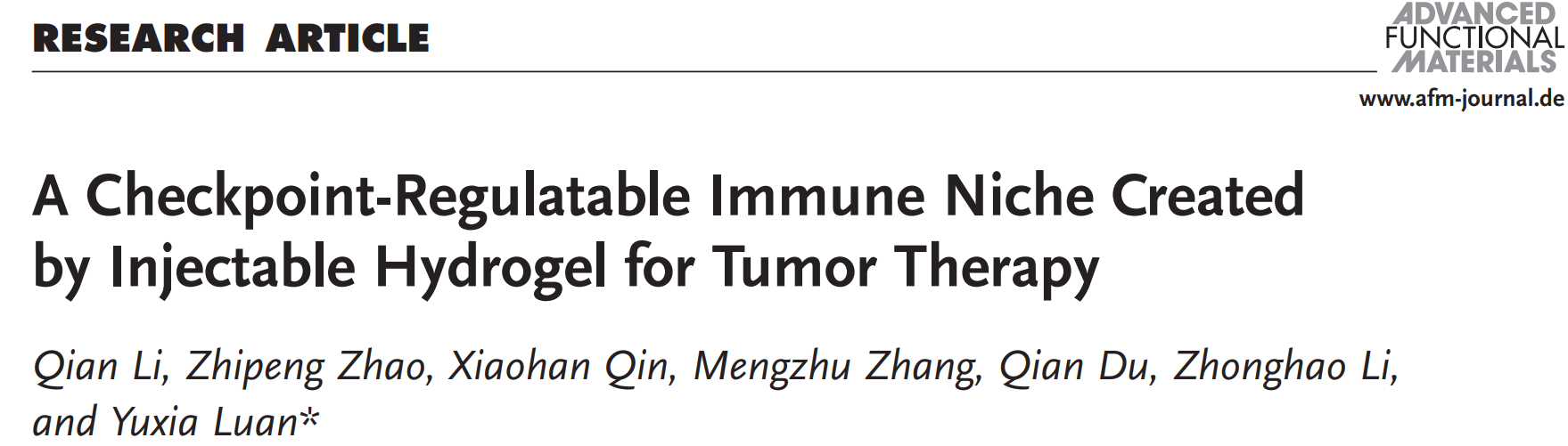 近日,山东大学齐鲁医学部团队在期刊ADVANCED FUNCTIONAL MATERIALS上发表了题为:A Checkpoint-Regulatable Immune Niche Created by Injectable Hydrogel for Tumor Therapy的研究论文(IF=18.801,工程技术1区)。报道了一种可重编程肿瘤PD-L1和循环外泌体PD-L1的注射水凝胶,提供了一种全新的免疫检查点调控的癌症免疫疗法。