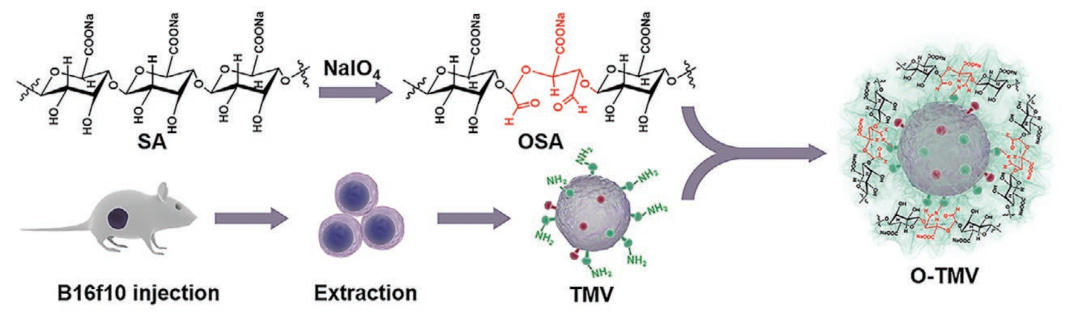首先,研究团队利用肿瘤膜蛋白的胺基与OSA的醛基之间的希夫碱键,制备了OSA修饰的肿瘤细胞膜囊泡凝胶剂,命名为O-TMV,并将DIR标记的O-TMV溶液注入肿瘤部位。然后,制备了具有DMA和ROSCO的O-TMV溶液在Ca2+存在下生成的O-TMV@DR水凝胶。SEM图像显示O-TMV@DR水凝胶与O-TMV水凝胶具有相似的多孔结构,是一种可注射的载药水凝胶。