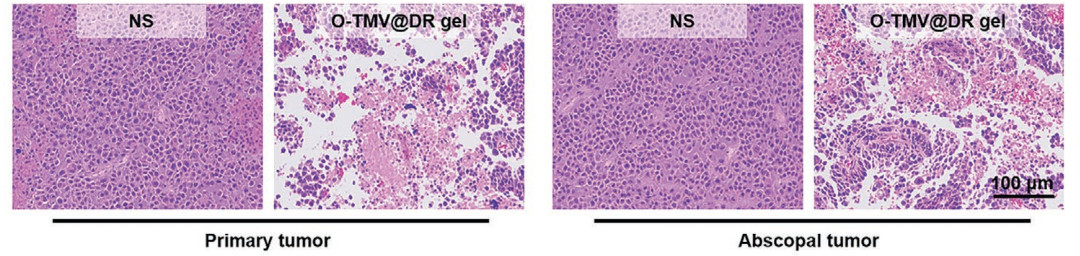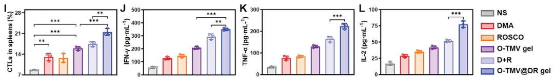 进一步地,他们研究了O-TMV@DR水凝胶的体内免疫反应。首先,团队人员测定不同处理后PD-L1在体内的表达水平。结果显示:O-TMV@DR水凝胶不仅在治疗的原发肿瘤部位产生局部免疫效应,而且在未治疗的体外肿瘤中也引发了免疫反应。为了验证这种水凝胶是否引起了广泛的全身免疫反应,研究团队检测了各组小鼠脾脏细胞内CTL水平。结果显示:经O-TMV@DR治疗后,脾脏CTL数以各组最高,为NS组的2.5倍;血清中IFN-γ、TNF-α和IL-2的水平含量上升明显。说明O-TMV@DR水凝胶的协同治疗引发了强烈的全身免疫反应,有效抑制肿瘤发展。