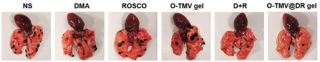 为了进一步评估O-TMV@DR水凝胶作为药物载体的潜力,研究团队用水溶性荧光染料IR820负载O-TMV水凝胶(O-TMV@IR820)在B16f10荷瘤小鼠中确定肿瘤体内药物释放行为。结果表明:O-TMV水凝胶具有良好的持久释放性能,可用于持久治疗;由于游离药物清除半衰期短,游离DMA和ROSCO对肿瘤抑制作用不大;O-TMV@DR水凝胶的系统副作用极小。