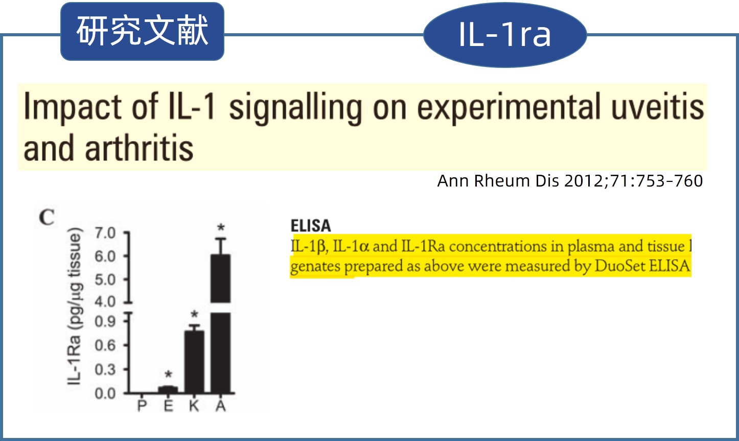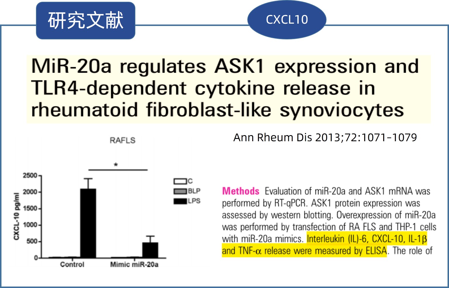 参考文献: 2. Articular inflammation is controlled by myeloidcell-derived interleukin 1 receptor antagonist during the acute phase of arthritis in mice[J]. Ann Rheum Dis,2012:71:281–287. IF=12.24 3. Articular inflammation is controlled by myeloid cell-derived interleukin 1 receptor antagonist during the acute phase of arthritis in mice[J].Ann Rheum Dis 2012;71:281–287. IF=12.24 4. MiR-20a regulates ASK1 expression and TLR4-dependent cytokine release in rheumatoid fibroblast-like synoviocytes[J].Ann Rheum Dis,2013;72:1071–1079. IF=12.24 5. The dual inhibitor of lipoxygenase and cyclooxygenase ML3000 decreases the expression of CXCR3 ligands[J]. Ann Rheum Dis 2008;67:524–529. IF= IF=12.24 |