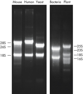 ![]() RNA定量 在检测RNA样本时,需确保比色杯中去除了RNA酶,特别是在使用分光光度测定之后仍需回收这些RNA的情况下。该条件可通过使用0.1 M NaOH,1mM EDTA和不含RNase的水的顺序洗涤来实现。使用稀释RNA的缓冲液为分光光度计设定空白对照。 使用分光光度法测定RNA浓度 在使用紫外通透的塑料比色杯的分光光度计中,测量260 nm的吸光值(A260)以确定RNA的浓度。为了确保获得有意义的结果,读值应在0.15与1.0之间。在260 nm波长下,1个单位的吸光值对应每毫升44 µg的RNA浓度(A260=1 → 44 µg/ml;基于标准的1 cm测光距离)。这一相关性仅对中性pH值条件下的检测有效。因此,如需稀释RNA样品,则应使用中性pH值的低盐缓冲液(例如10 mM Tris•Cl ,pH7.0)。 在检测RNA样本时,需确保比色杯中去除了RNA酶,特别是在使用分光光度测定之后仍需回收这些RNA的情况下。这可以通过使用0.1 M NaOH,1mM EDTA和不含RNase的水的顺序洗涤来实现。使用稀释RNA的缓冲液为分光光度计设定空白对照。列举一个RNA定量中的计算实例如下: RNA定量举例 RNA样品的体积= 100 µl 稀释=10 µl RNA样品+490µl 10 mM Tris•Cl ,pH 7.0(1/50的稀释比) 使用1 ml(已去除RNA酶)比色杯,检测稀释后样本的吸光度 A260 = 0.2 RNA浓度 = 44 µg/ml x A260 x稀释系数 = 44 µg/ml x 0.2 x 50 = 440 µg/ml RNA总量 =浓度x以毫升为单位的样品体积 = 440 µg/ml x 0.1 ml = 44 µg RNA 确定RNA的品质 RNA纯度 在260 nm与280 nm读值之间的比例(A260/A280)能够反映RNA的纯度,因为如蛋白一类的污染物会吸收紫外光。不过,A260/A280的比值也受到pH值的显著影响。当使用没有缓冲能力的水时,pH值与A260/A280的比值结果都会发生大范围的改变。 较低的pH值会导致A260/A280的比值变小,对蛋白质污染的敏感性也会随之降低(3)。 为了获得精确的比率,我们建议在微碱的低盐缓冲液中检测吸光度(例如10 mM Tris•Cl,pH7.5)。在10 mM Tris•Cl,pH 7.5缓冲液当中,纯RNA的A260/A280 比率约为1.9–2.1。 注:某些分光光度计在检测纯RNA时,可常规获得高达2.3的比值。 请确保使用同种溶液校准分光光度计。不过,为了准确确定RNA的浓度,我们仍建议使用中性缓冲液稀释RNA样本,因为吸光度和浓度(A260读值为1相当于44 µg/ml的RNA浓度)之间的关系是一个基于中性条件获得的吸光系数。 RNA的完整度 总RNA的完整度和大小分布可以通过变性的琼脂糖凝胶电泳、溴化乙锭染色或市售的检测系统(如QIAxcel系统或Agilent 2100 )进行检测。每条核糖体RNA的富集区域在凝胶染色之后应显现为锐利的条带。28S核糖体RNA的条带亮度应为18S rRNA条带的两倍左右。如果某一泳道中核糖体RNA条带不够锐利,却出现小尺寸RNA的弥散情况,则很可能因为RNA样品在制备过程中发生了严重的降解。 Agilent 2100 Bioanalyzer也能够提供RNA完整数目(RNA Integrity Number,RIN)这一参数,作为对RNA完整度的一个有用量度。在理想情况下RIN值应接近10,不过在许多情况下(特别是对组织样本来说),RNA品质主要取决于原始样本的保存情况。 不同来源的核糖体RNA大小