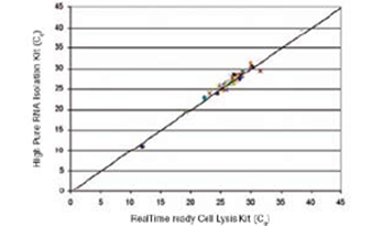 RealTime ready Cell Lysis Kit 专为快速、高性能的基因表达研究设计,使用培养细胞为原材料,仅需2个步骤就可开始实时荧光PCR。试剂盒可在室温下,于5分钟内一次性完成3 - 30,000个细胞的裂解,裂解产物可直接用于cDNA的合成,省却了繁琐的RNA提取步骤。得到的cDNA适用于各个通量的实时荧光PCR分析(包括LightCylcer® 480, 96或384通量以及LightCylcer® 1536)。